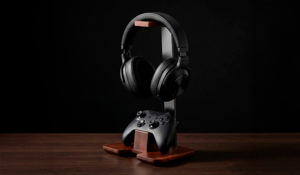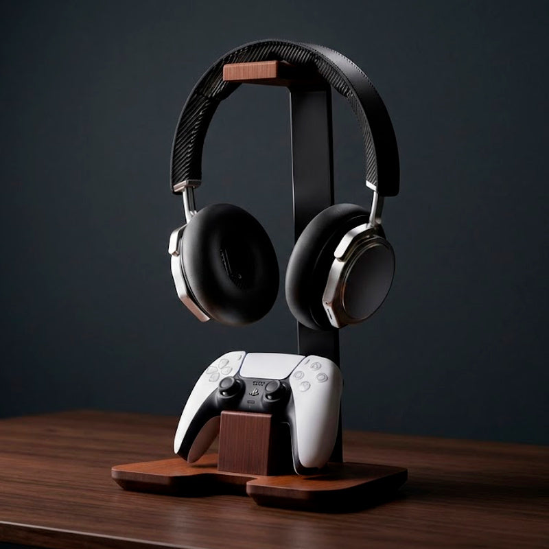 Um lar exclusivo para seu headset e controle. Design elegante que harmoniza e organiza seu espaço com maestria.