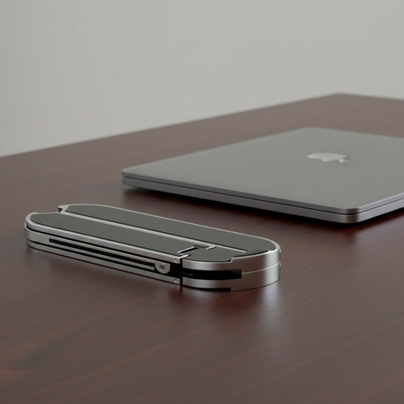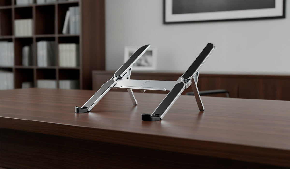 Sistema de elevação até 90° com travamento preciso e design dobrável ultracompacto. Transforme qualquer superfície em estação ergonômica profissional em segundos.