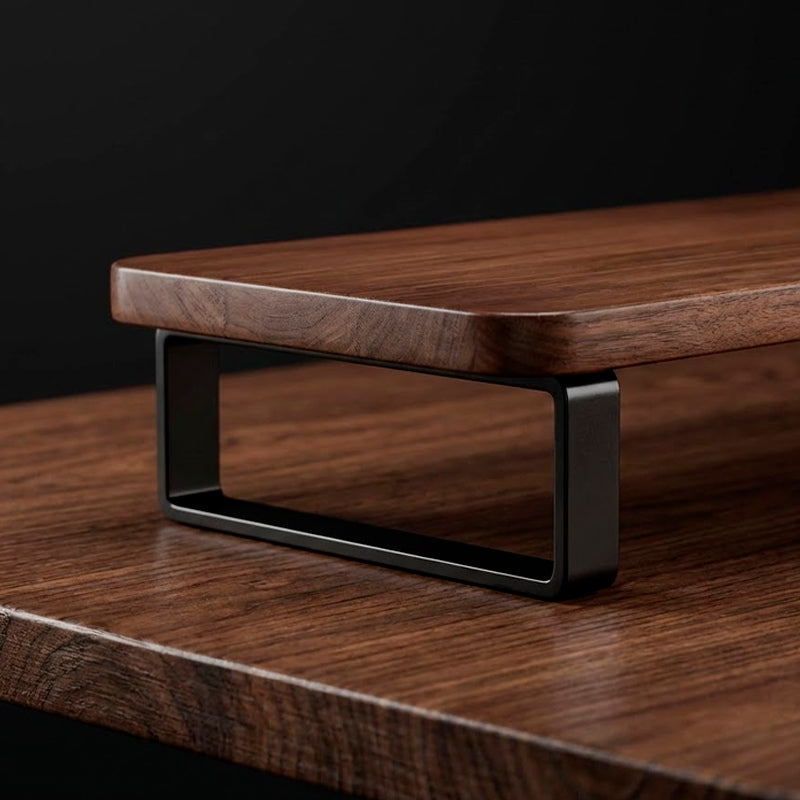 A madeira premium entrega uma textura nobre e um visual sólido, enquanto a base em metal preto vazado cria um contraste moderno e preciso. Além disso, os materiais são resistentes à água e a arranhões, permitindo o uso diário sem preocupação com marcas ou desgaste.