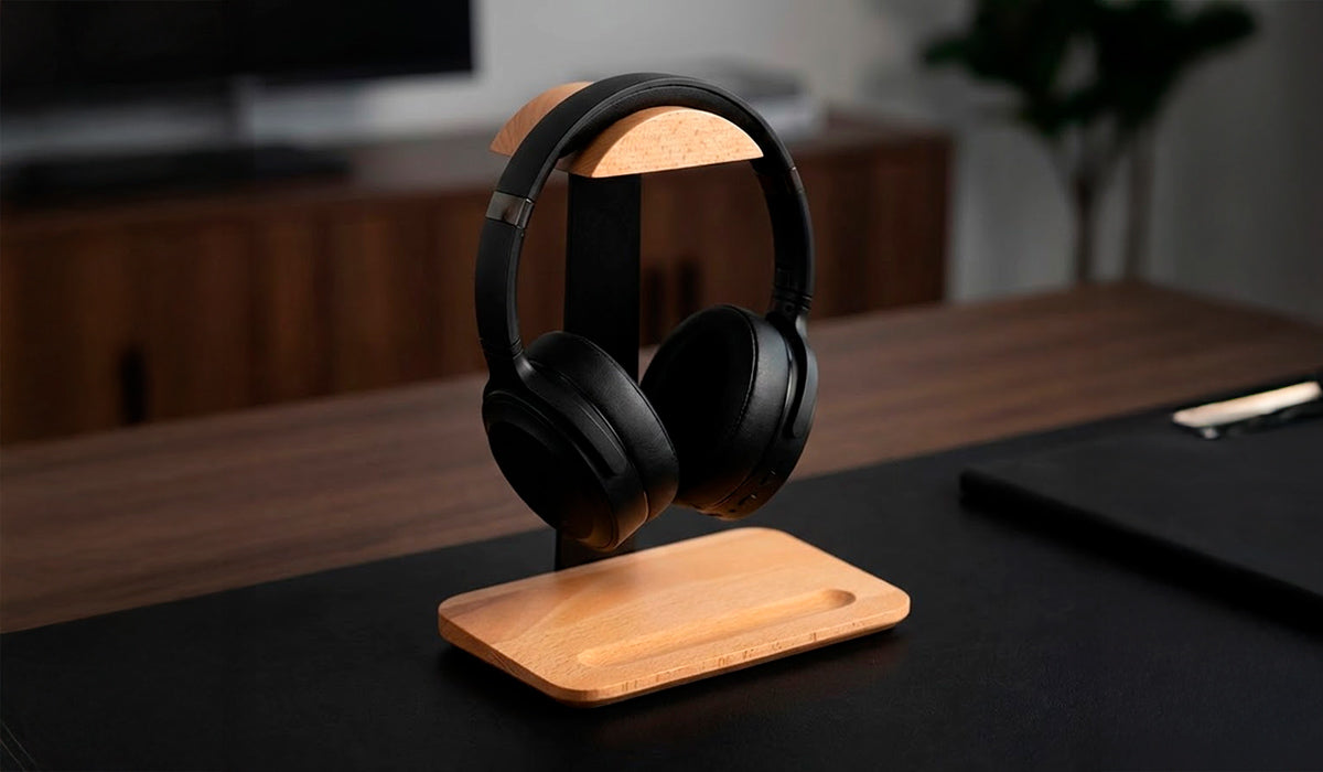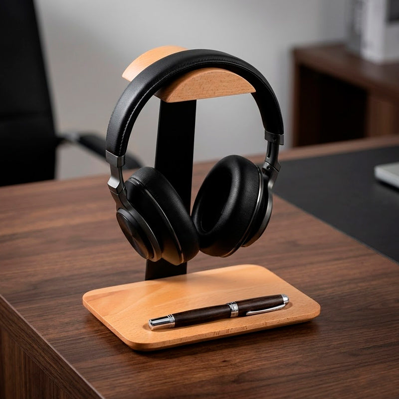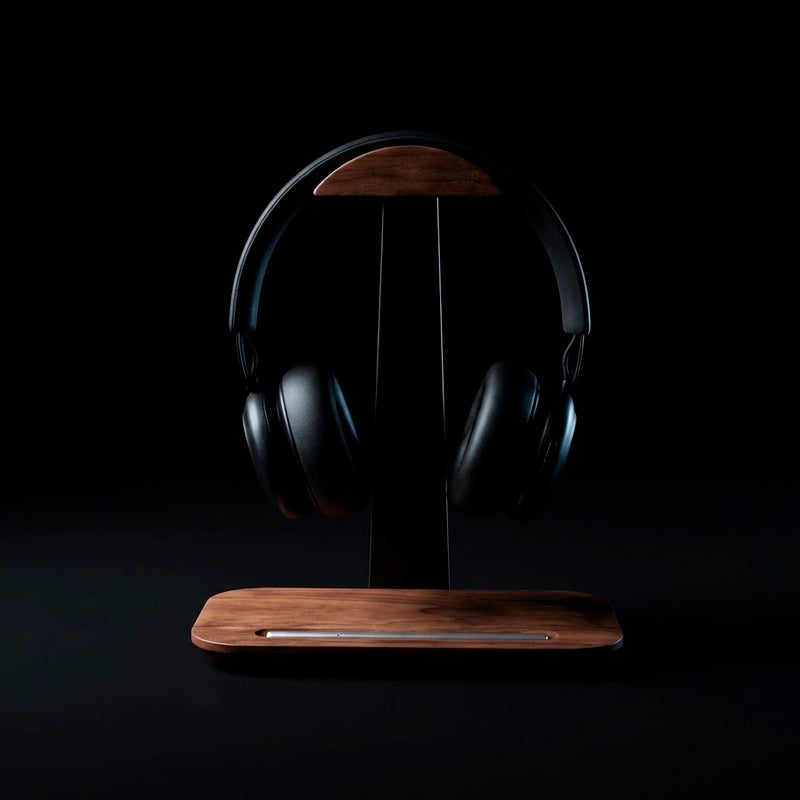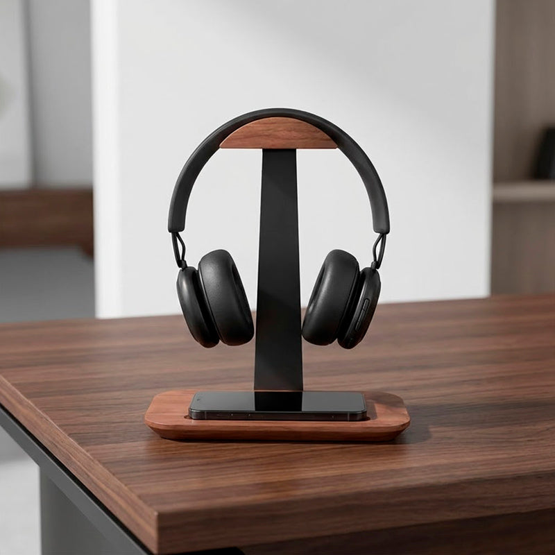 Sistema inteligente que acomoda headset e smartphone (ou caneta) em um só lugar. Elimine bagunça na mesa com design que maximiza organização sem comprometer estética.